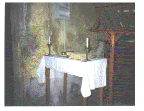 Hier scheint selbst die Patina schon verblichen: die letzte Messe muss Jahre zurückliegen. Doch nein, in der Sakristei ein Stillleben par excellence: auf dem Stehpult liegt eine geöffnete Bibel, zwischen den Seiten die Brille des Priesters, geradeso als habe er sie im Moment abgenommen und sein Lesen unterbrochen, um sich einem seiner Schäfchen zu widmen oder die Beichte abzunehmen. Doch weit und breit sind weder Priester, noch irgendeine verlorene Seele auszumachen ...