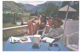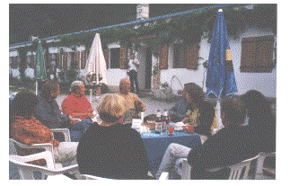 Später verstreuen wir uns dann am Bach und in der umliegenden Bergwelt, nachmittags aber finden sich alle wieder unter den Sonnenschirmen ein. Heute soll die Entscheidung getroffen werden, ob die morgige Tour 650 Meter Aufstieg in fünf Wanderstunden oder 1200 Meter Aufstieg in sieben Stunden hart sein wird. Wir entscheiden uns für die erste Variante. Noch in Gedanken an morgen ertönt eine uns bekannte Stimme: „Ihr faule Bande!“ – Marie France und Kurt haben den Weg von Ussolo nach Campo Base in zwei Etappen hinter sich gebracht – schön, dass wir uns hier noch einmal treffen!